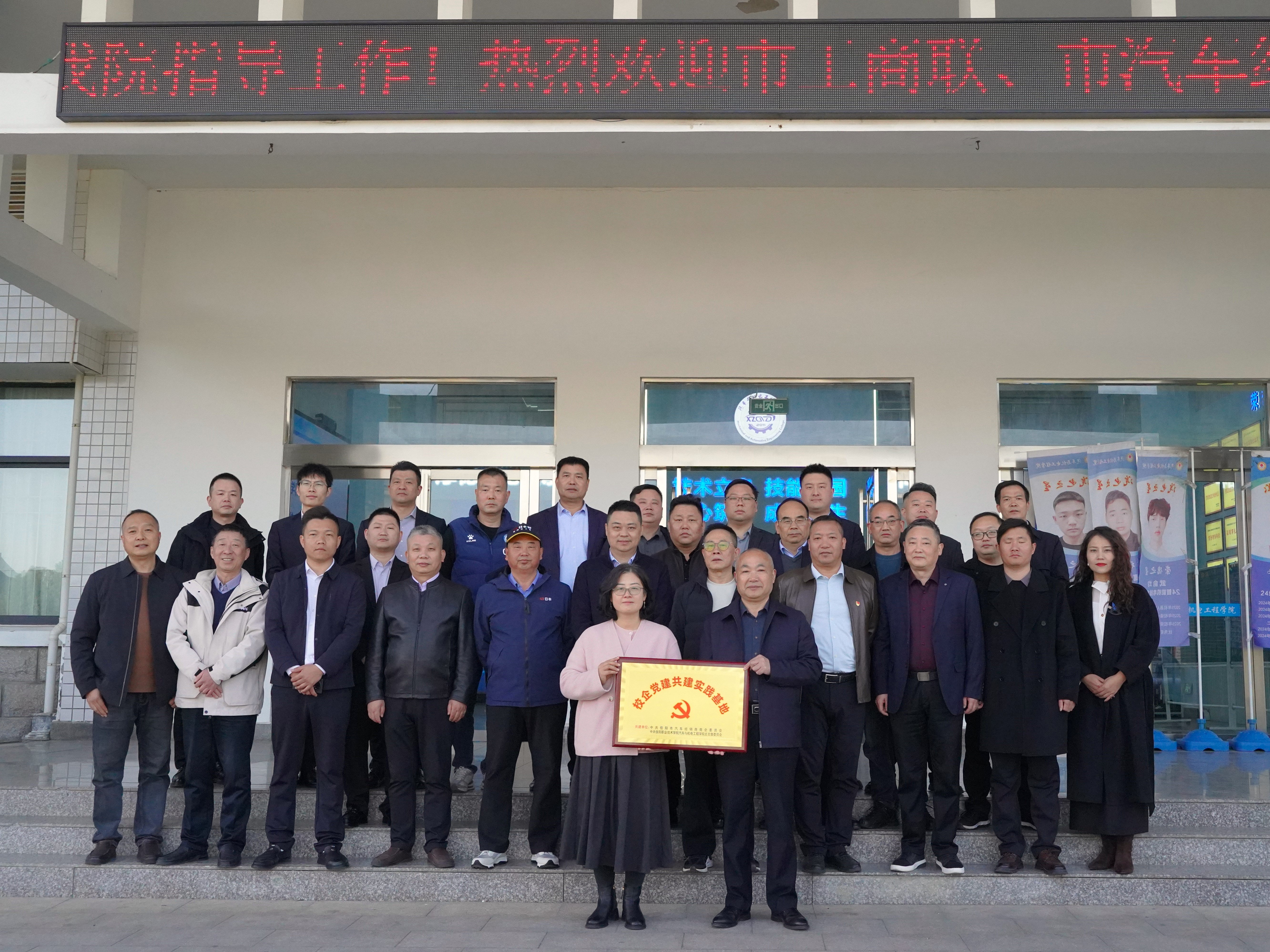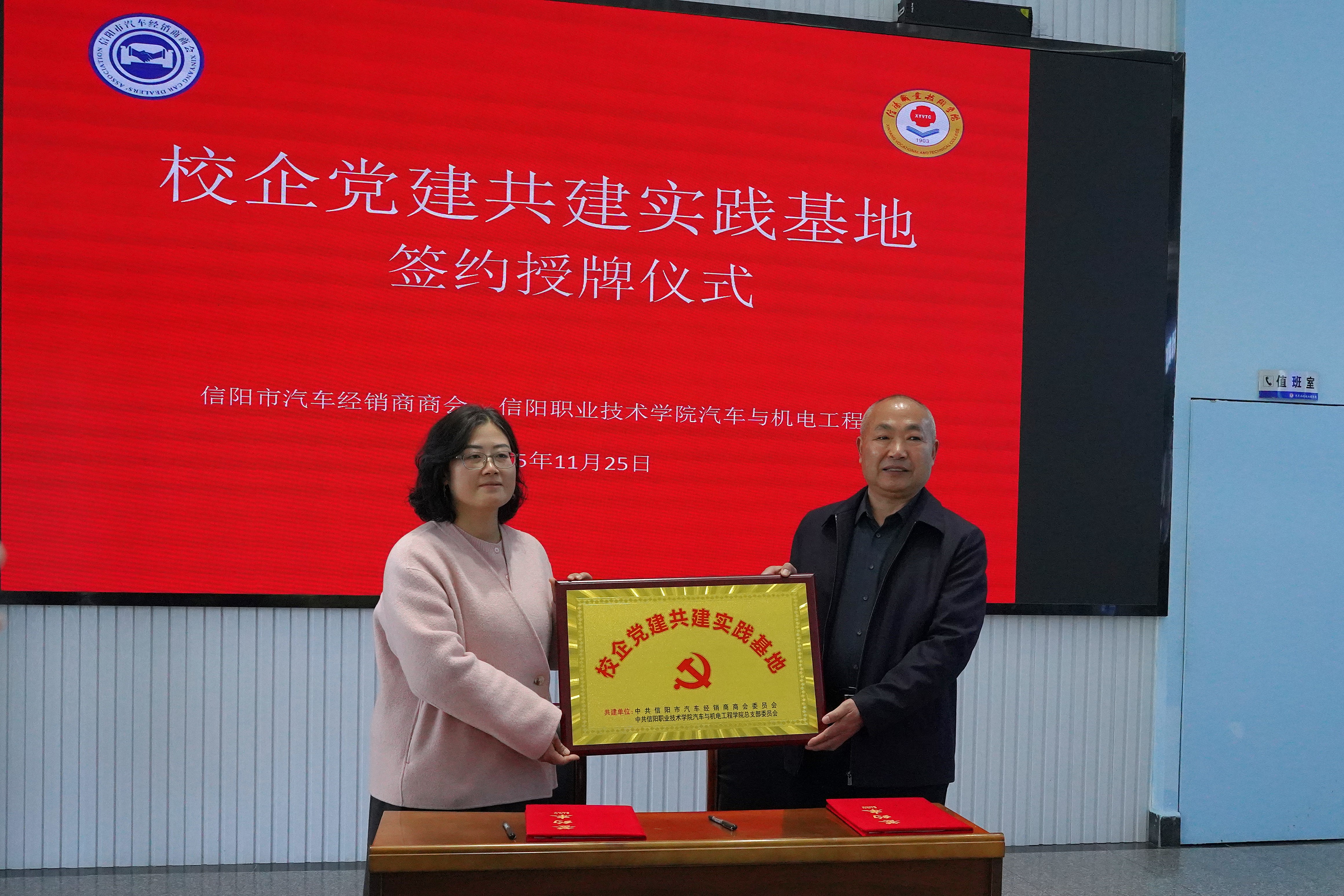 2025 年 11 月 25 日下午,信阳市汽车经销商商会与信阳职业技术学院汽车与机电工程学院党总支联合开展 “结对帮扶共建双升” 活动。校党委委员、副校长周有国,校党委委员、组织部部长裴波莅临指导;信阳市汽车经销商商会委员会书记余自锋、会长俞勇及商会成员代表,汽电学院党总支书记朱燕鸣、院长吕争出席活动;信阳市建筑装饰装修协会、信阳市建设工程招标投标协会代表共同见证此次活动。