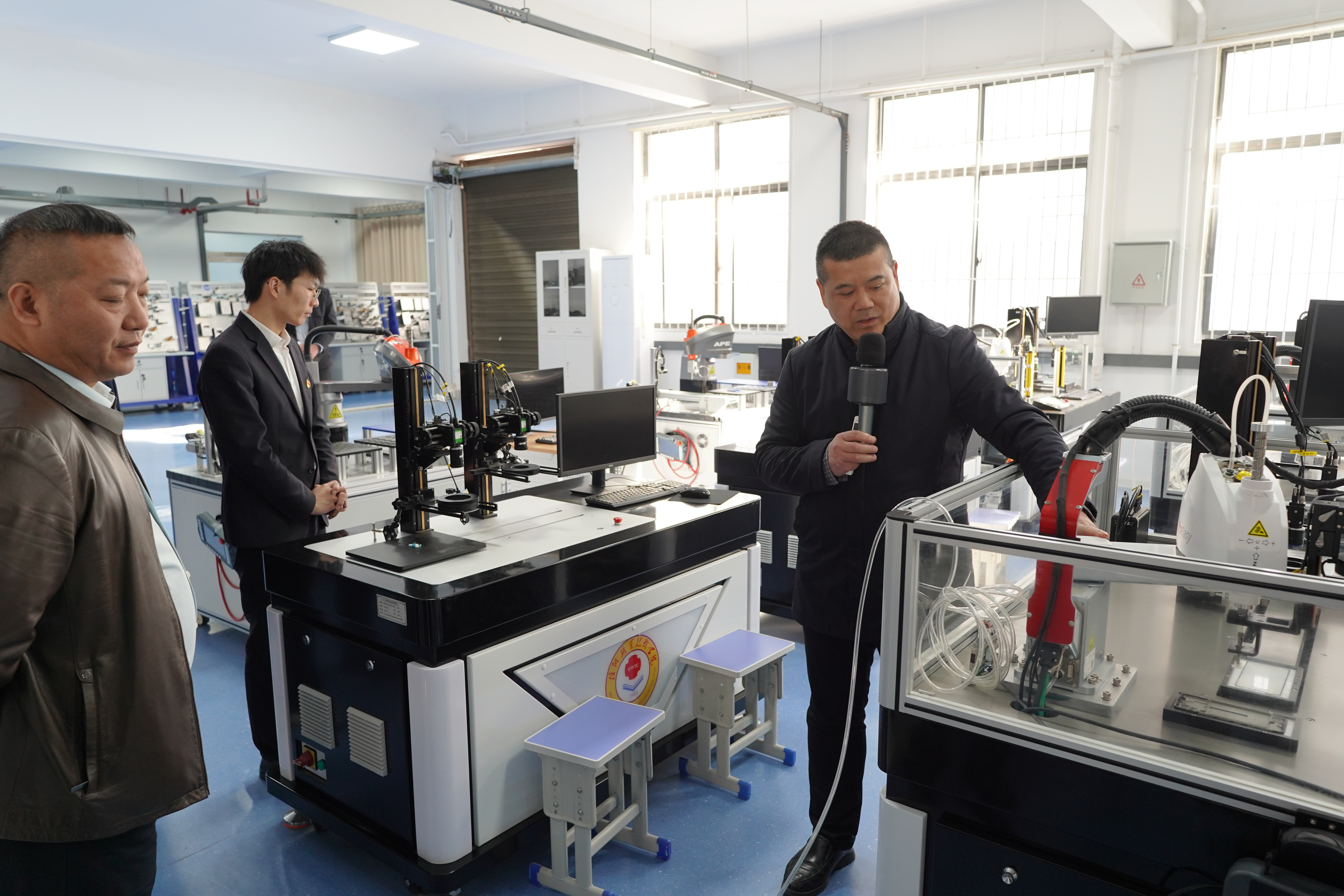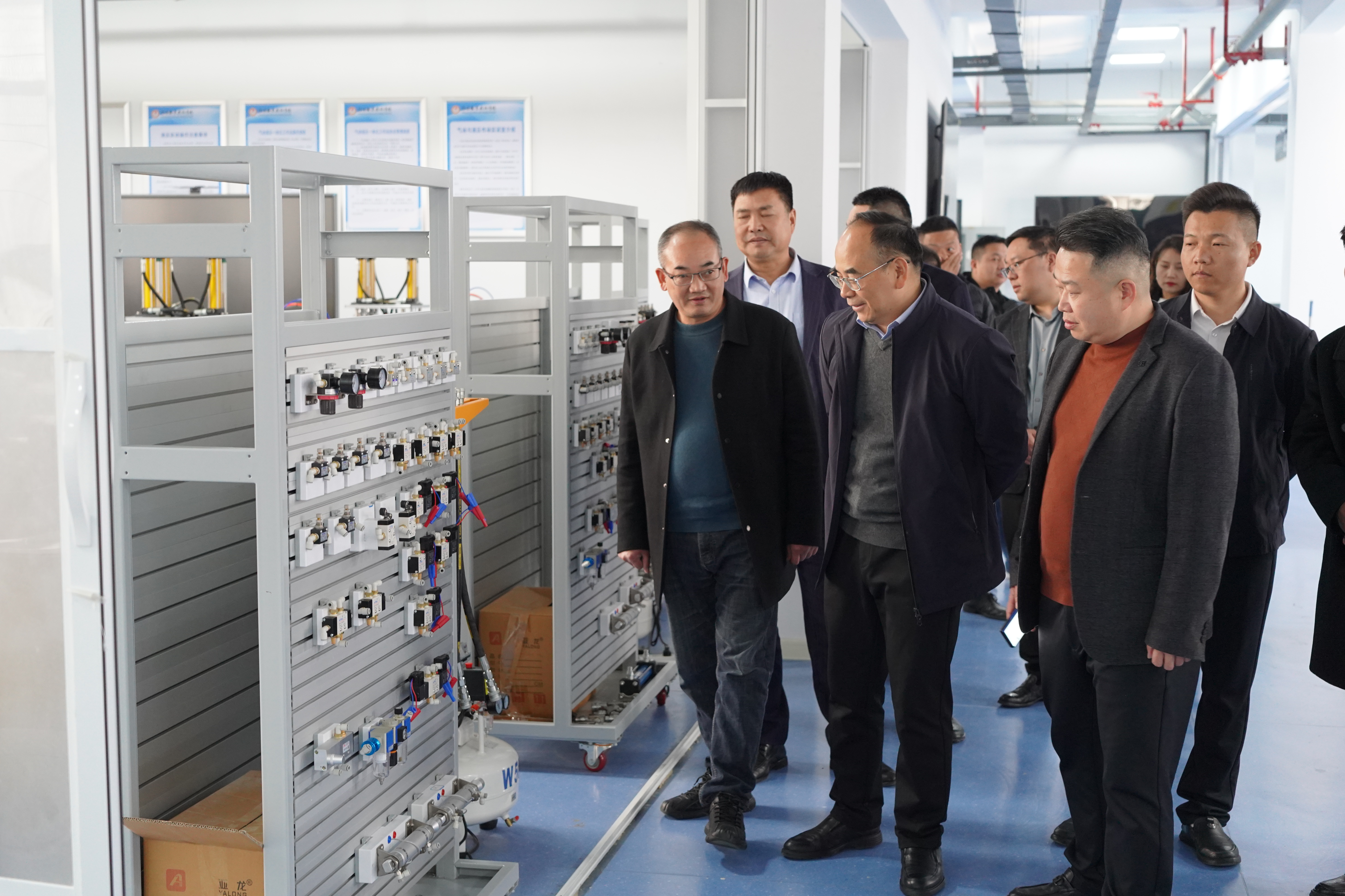 授牌仪式结束后,在吕争的陪同介绍下,与会嘉宾实地参观了学院汽车实训教学实验基地与标准化党建阵地,深入考察了新能源汽车实训室"岗课赛证"融通模式、智能制造基础实训室工业机器人教学实景、虚拟仿真基地数字孪生技术应用等教学实践成果。